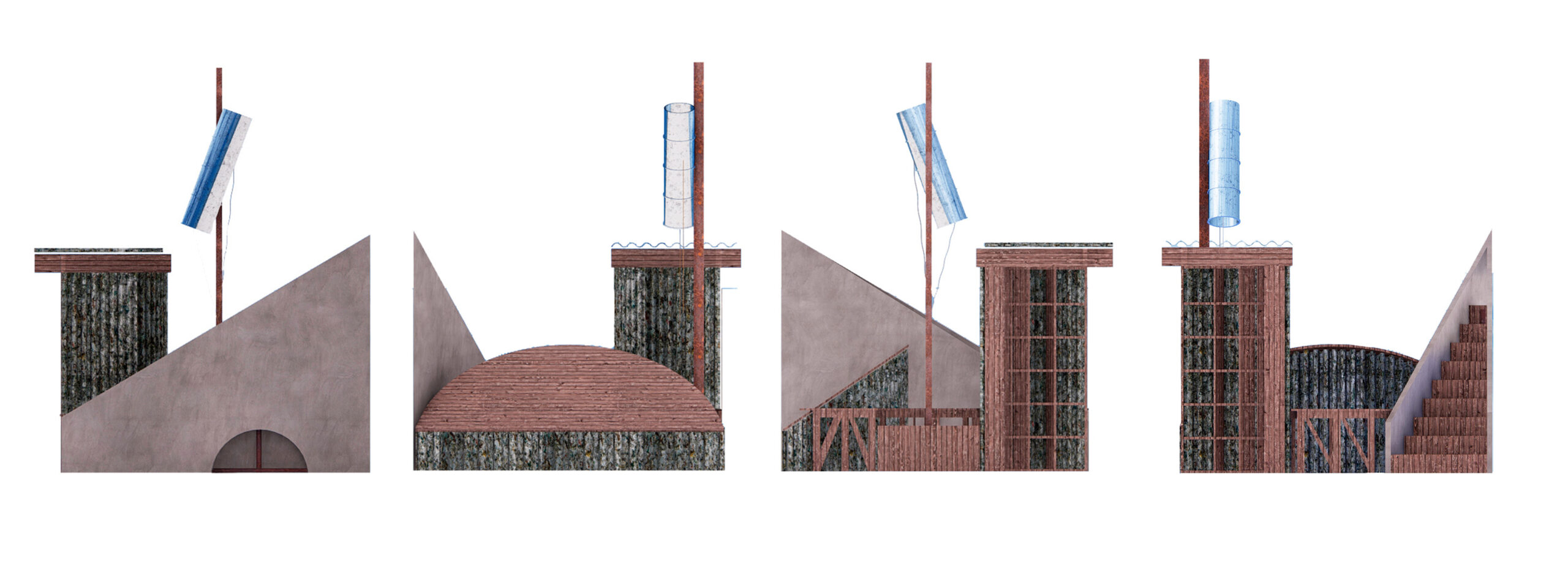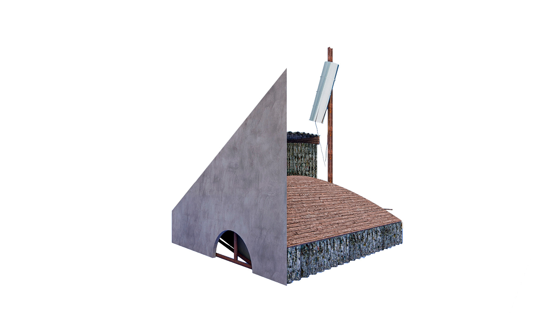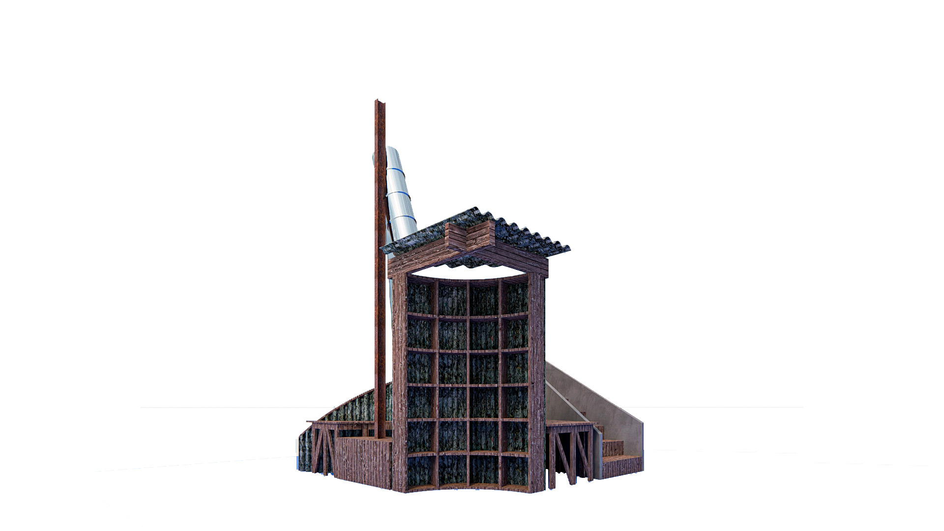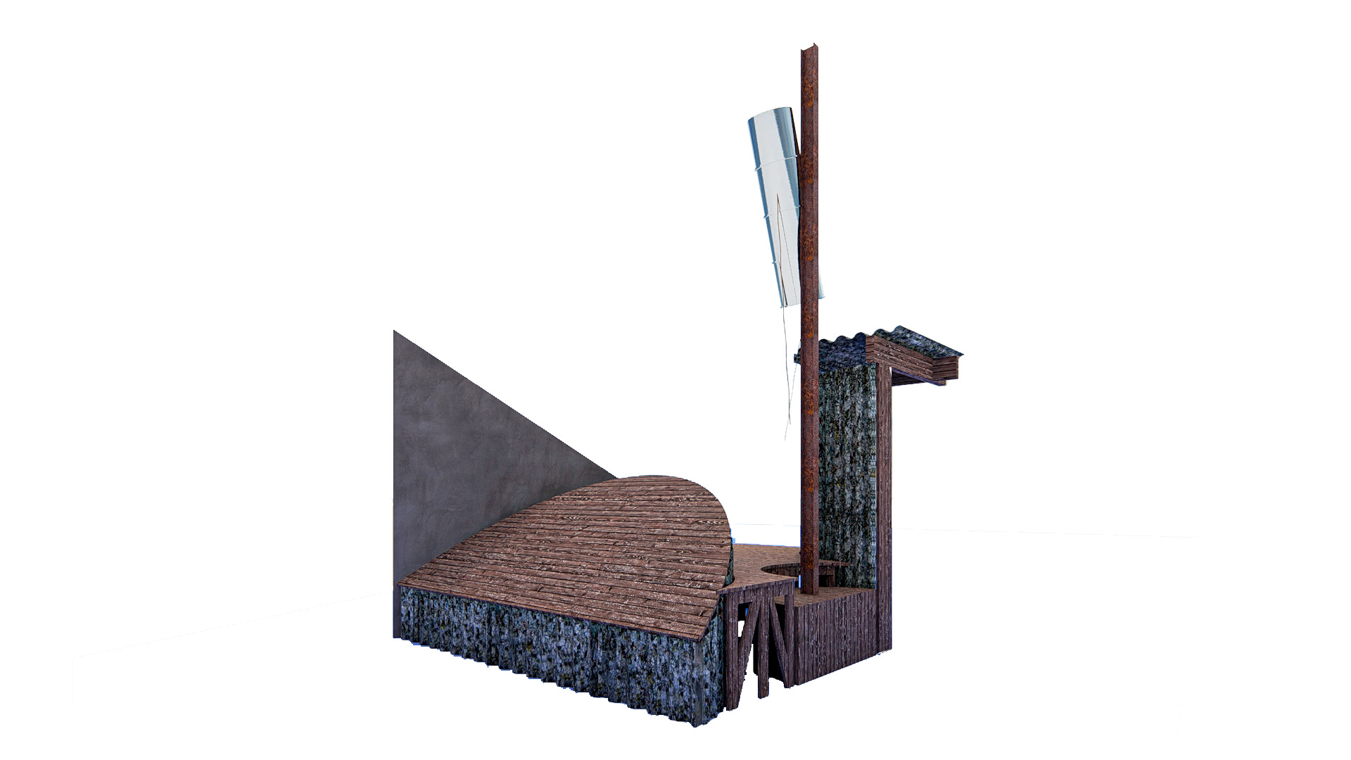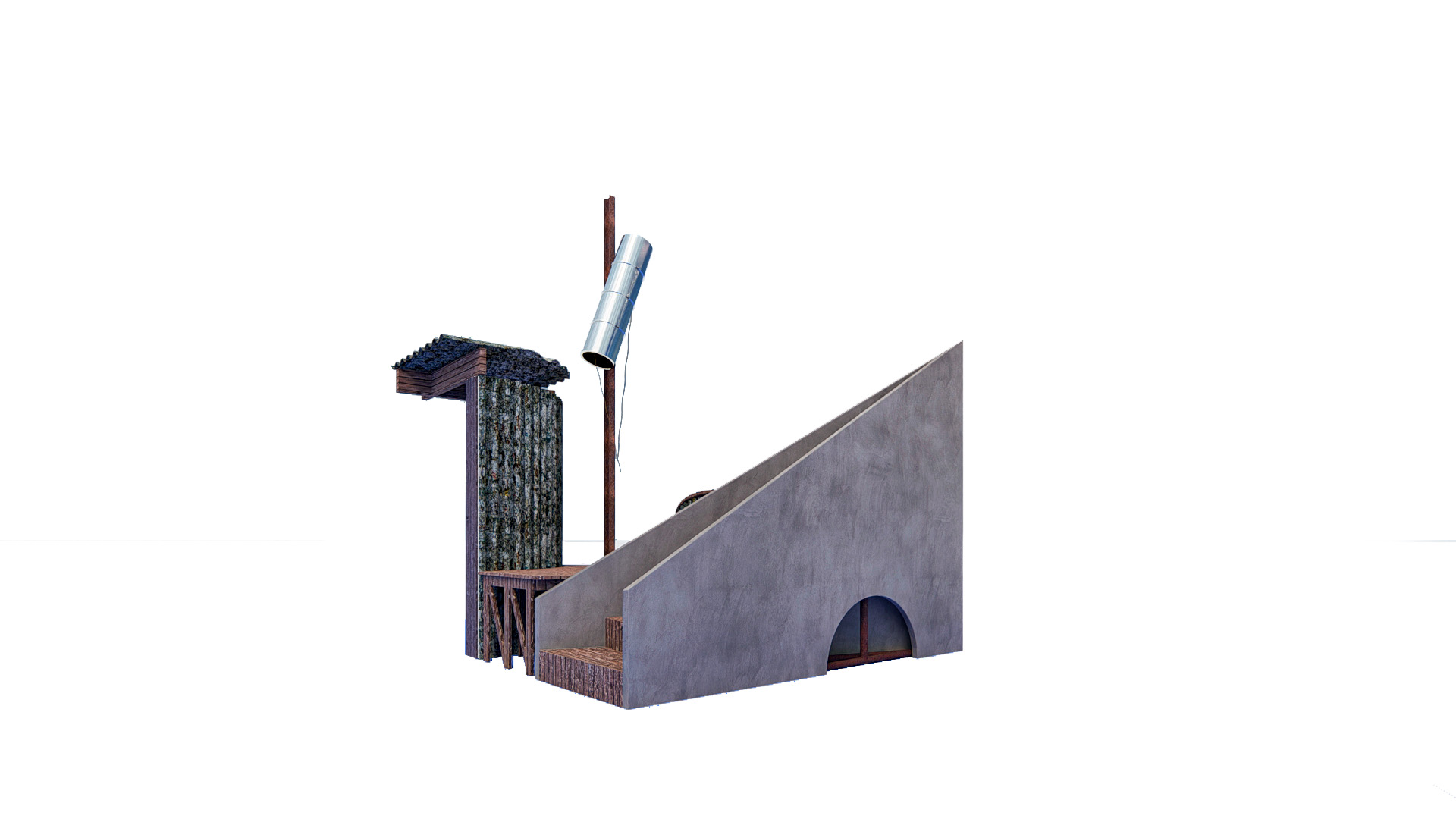At the core of the project lies a strong statement on recycling and material reuse. The site itself contains a large number of existing elements, which we have carefully inventorized, allowing us to base the construction of the pavilion almost entirely on reclaimed materials. Currently, 95% of the materials used come directly from the site, ensuring a minimal environmental footprint and a deep material connection with the location. The only non-recycled components are elements such as wheels, a lamp, and screws.
