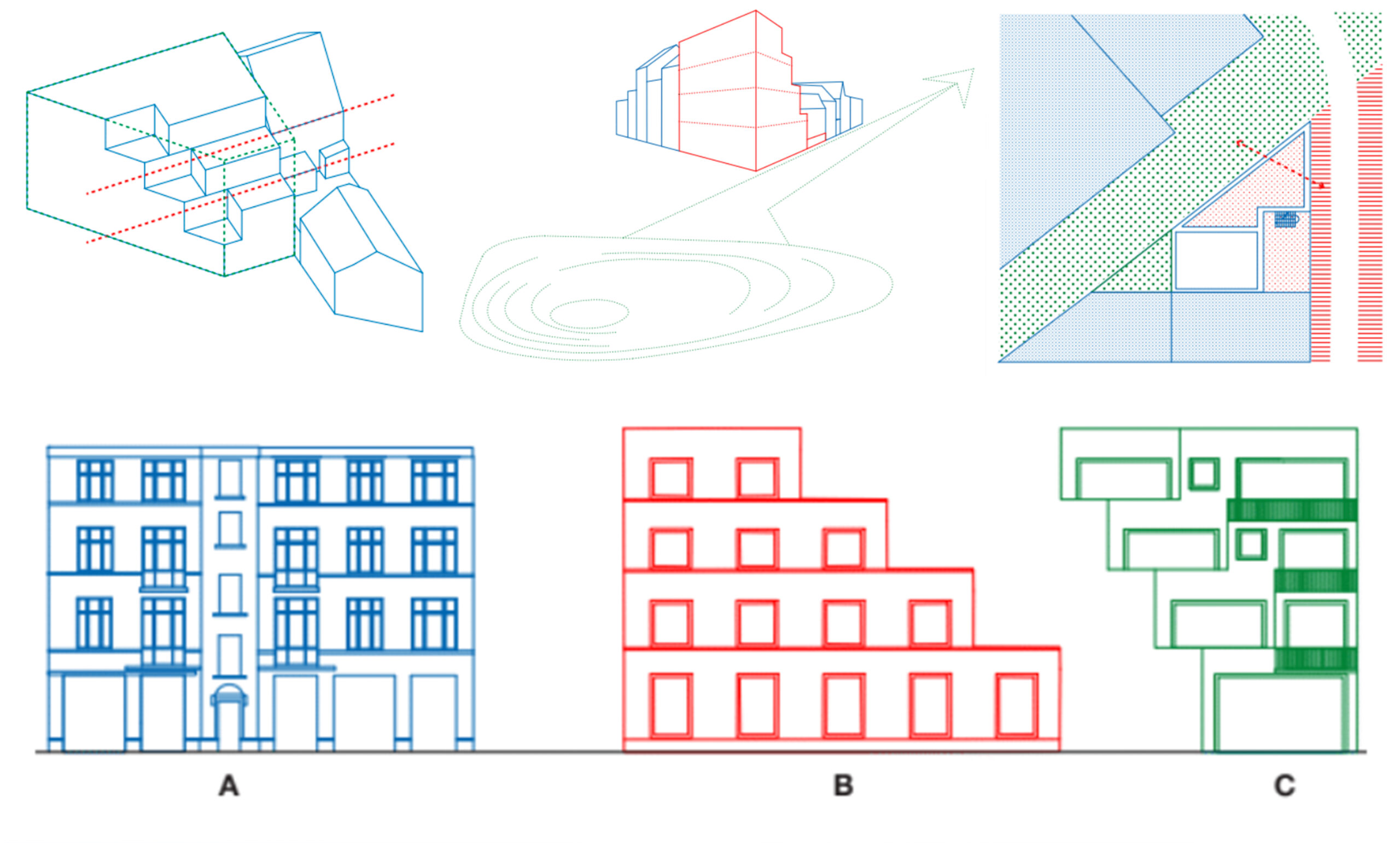 In this context, the new corner building introduces public housing and shared facilities, supporting the return of residents and the improvement of their living environment. Positioned as a hinge at the entrance of the district, the project engages directly with the future Sennette Park and the network of new pedestrian connections, creating a strong link between street, housing, and public space.