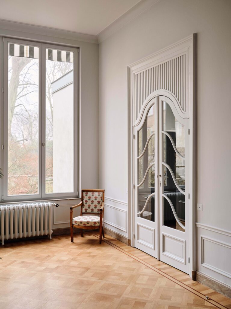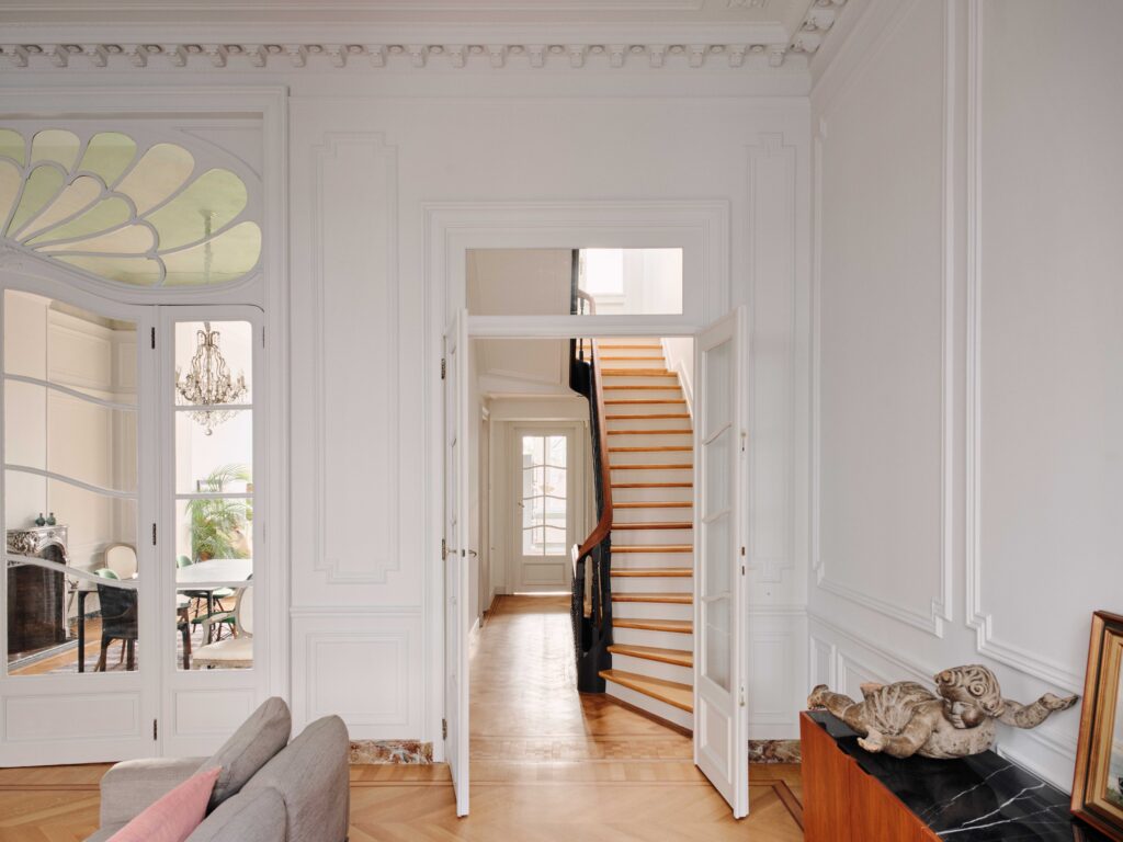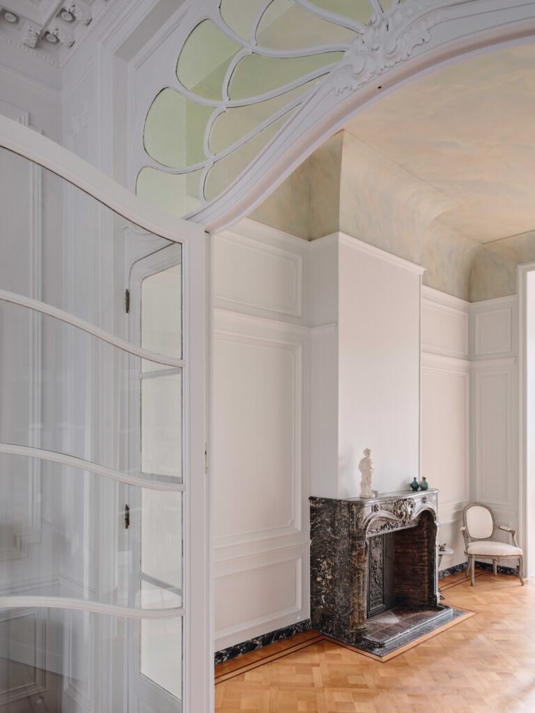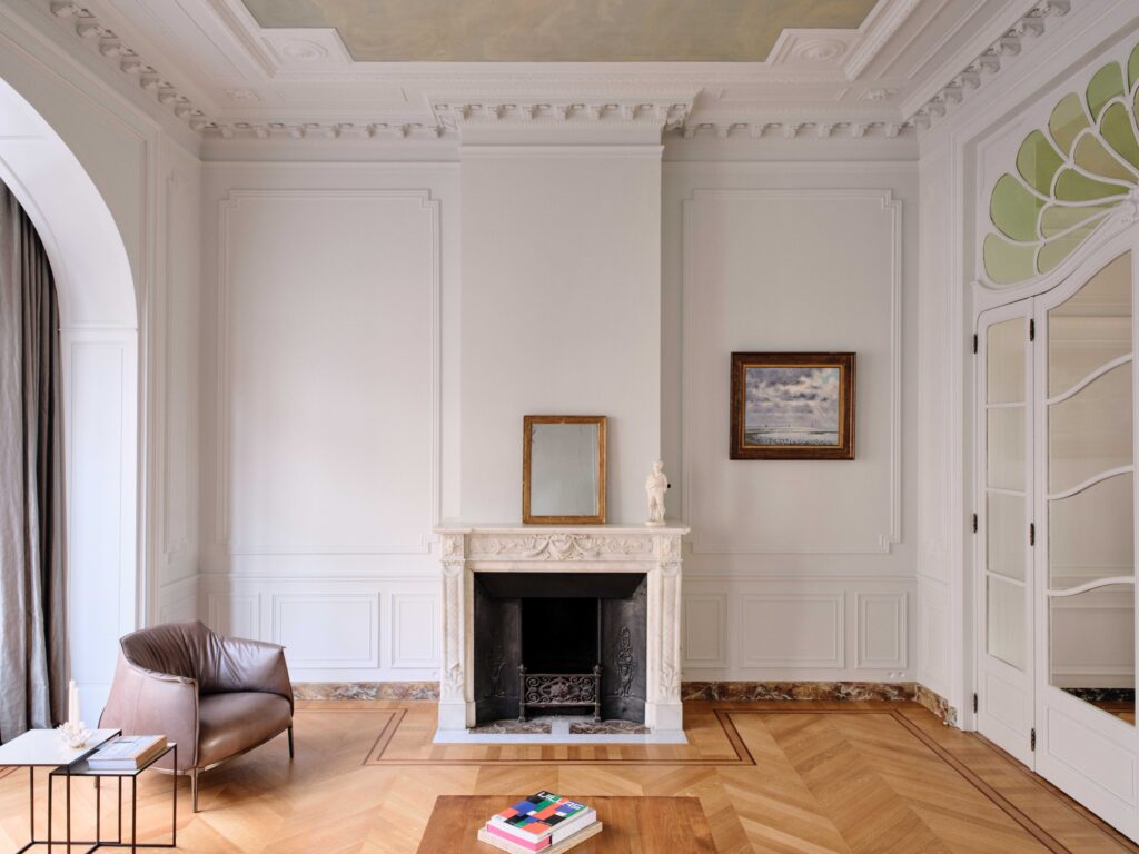 : Restoring a Brussels MansionThe intervention proposes a comprehensive and coherent redesign across all seven levels of the residence, using refined colors and noble materials to preserve its unique character. The spatial organization of the upper floors has been completely rethought to bring more light and fluidity to the circulation, optimizing each space while respecting the existing structure. The historical decorative elements, such as moldings, frescoes, and wood paneling, have undergone meticulous restoration by specialized craftsmen to restore their former splendor. Every furniture choice has been considered in detail, with custom-made pieces that blend harmoniously with the volumes and the spirit of the place. The project highlights the richness of the past while infusing a discreet and elegant modernity. The entire project demonstrates a profound respect for Brussels’ architectural heritage, combining tradition and innovation to offer a contemporary and refined interpretation of this exceptional residence.