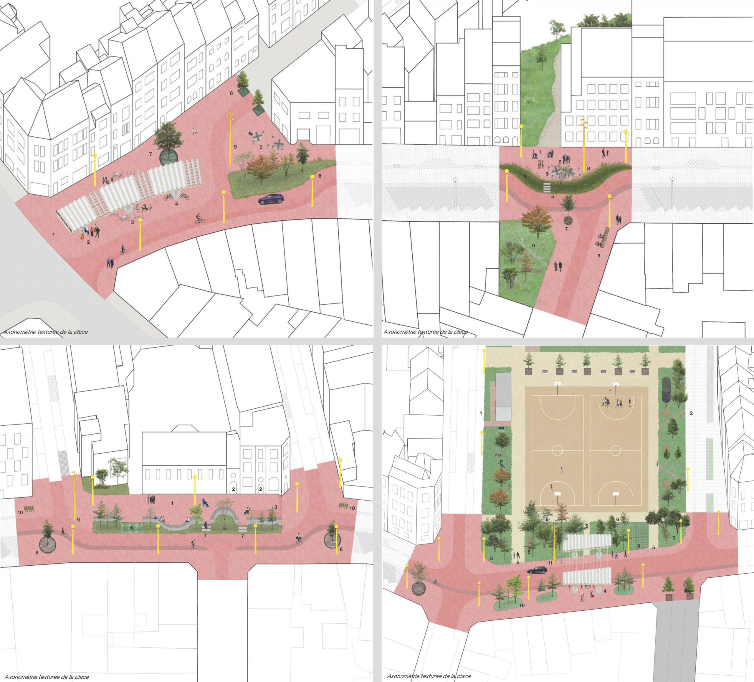 Read moreVegetation plays a central role, reinforcing ecological continuity, improving stormwater management, and creating a sensory and social experience. Street trees, isolated specimens, planted pockets, wetland zones, and fruiting shrubs are deployed to enhance biodiversity and provide edible landscapes linked to local community gardens. The former Parucq stream is revealed as a green axis connecting Victoria Park to the Schmitz block, while permeable surfaces, planted swales, and retention strategies optimize water infiltration and mitigate urban heat island effects. The plant palette is carefully selected for aesthetic, ecological, and pedagogical qualities, maximizing accessibility for maintenance and interaction with local residents.