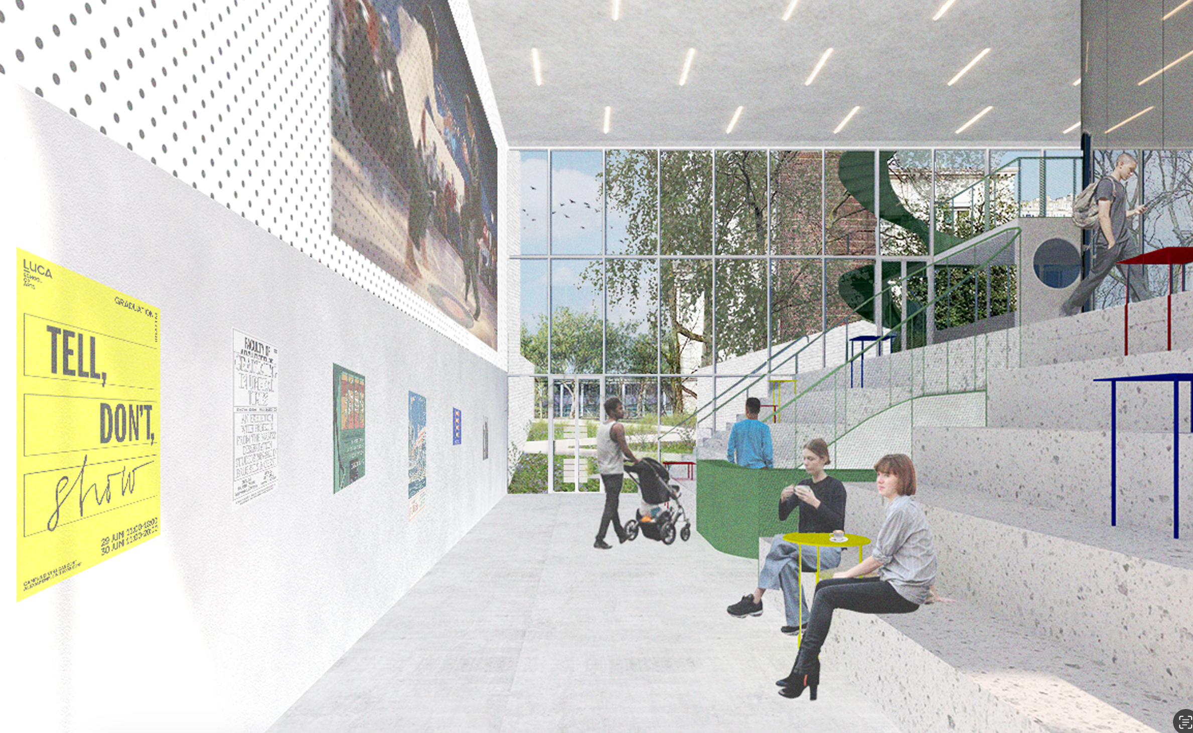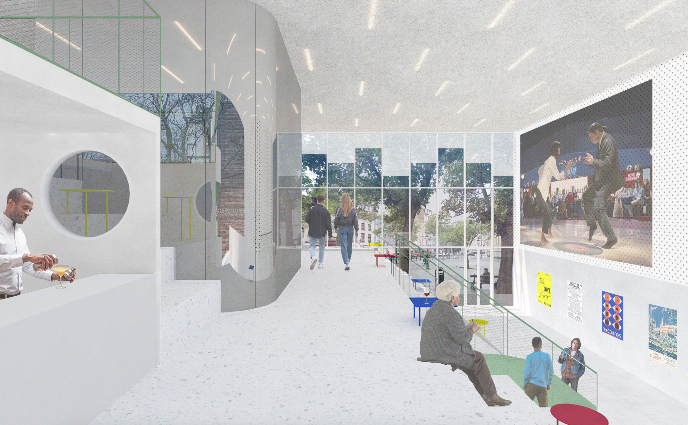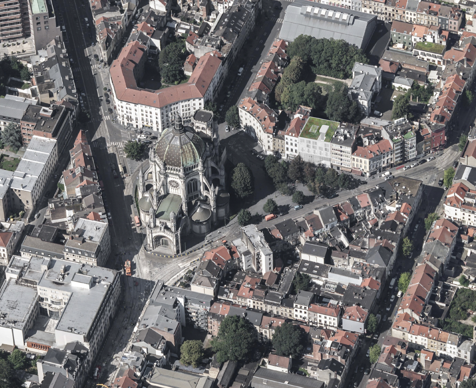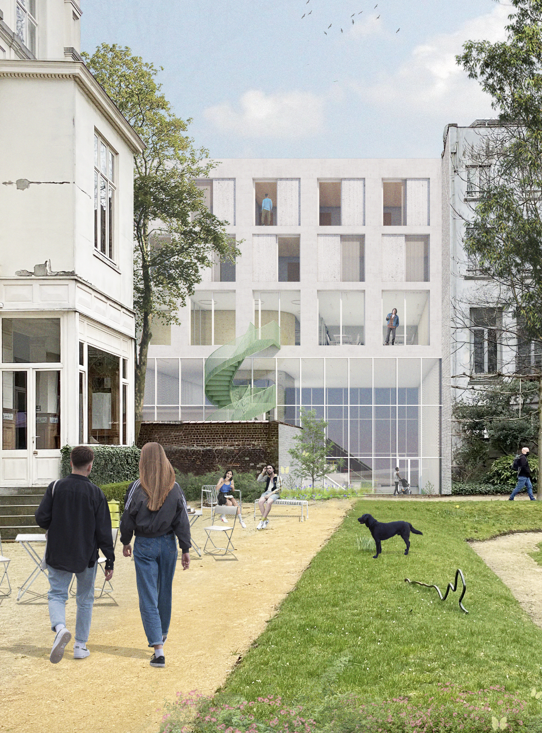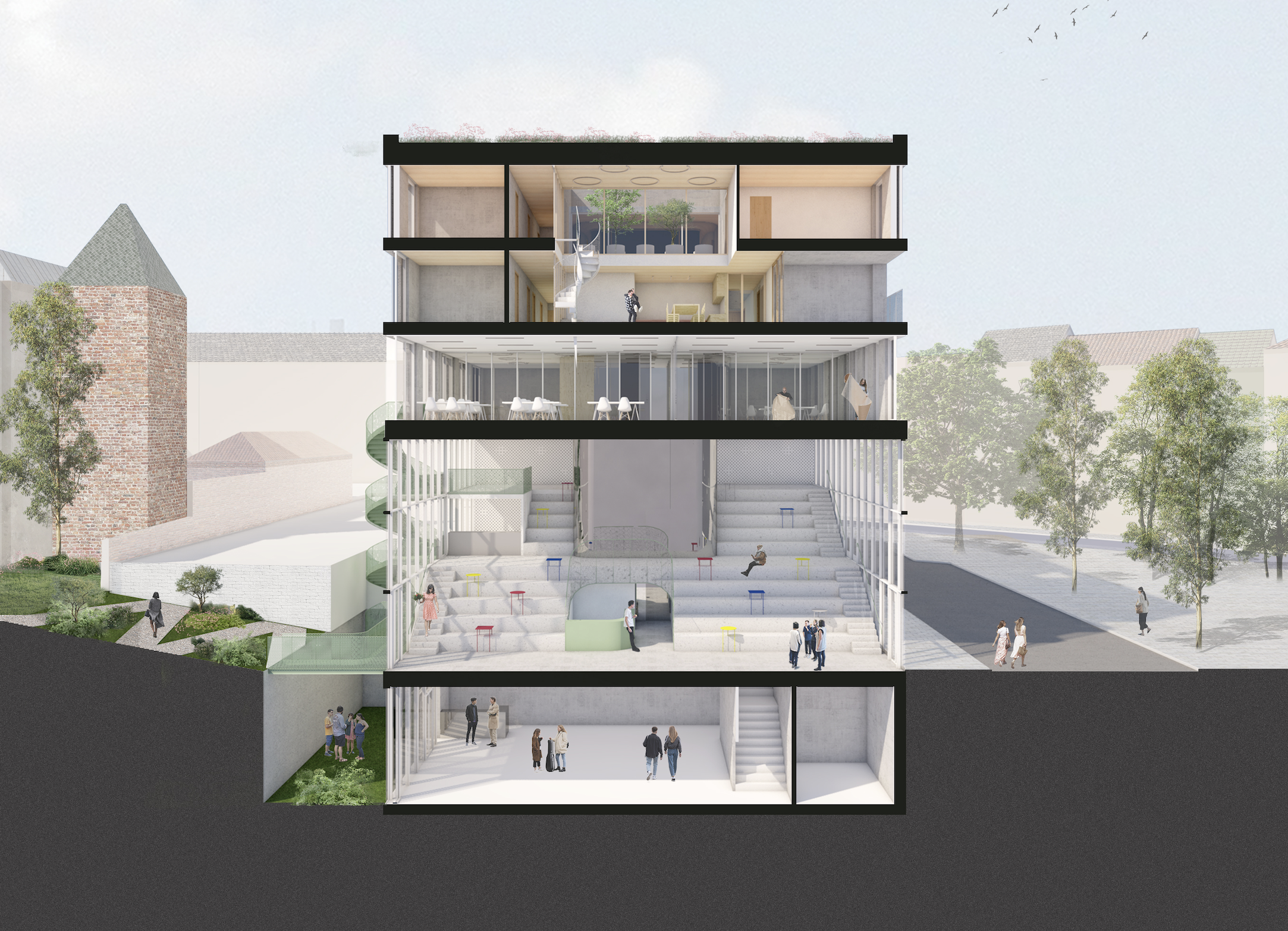 : Reine - Urban Student housingThe student hub at Place de la Reine, Schaerbeek, is conceived as a cultural and social anchor within a dense urban fabric. Surrounded by institutions such as Les Halles, Botanique, the Maison des Arts, and the Royal Sainte-Marie Church, the project reinforces this existing network by opening new connections and fostering exchange.