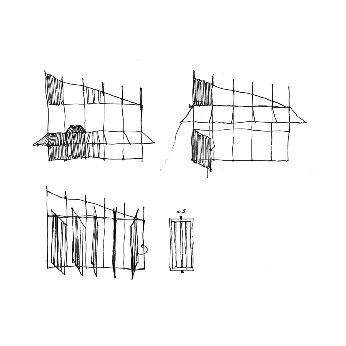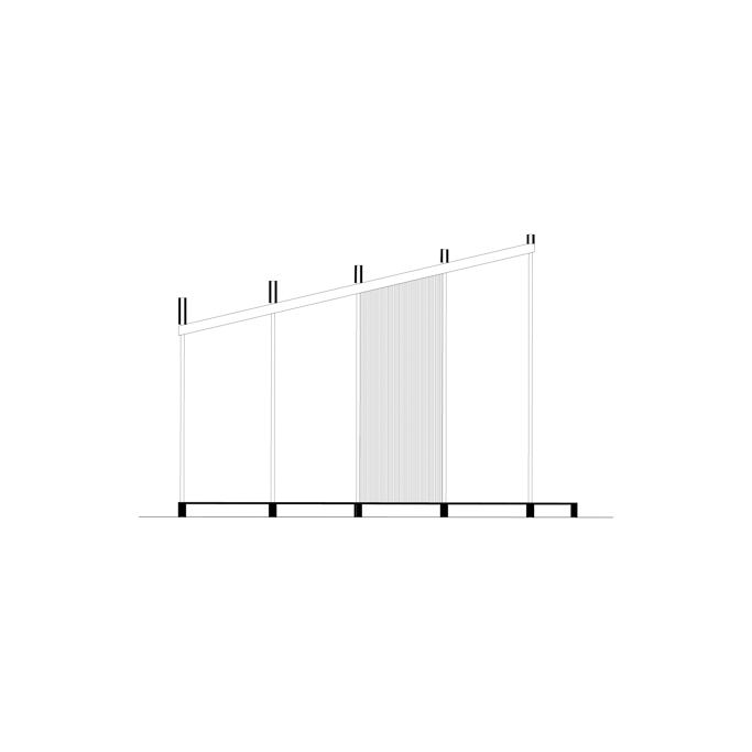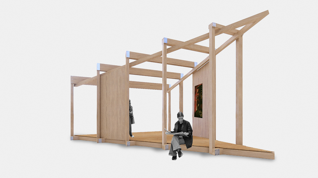 The pavilion is not fixed in use. Horizontal slats support hanging elements such as screens, panels or fabrics, attached magnetically to transform the space into an exhibition or performance platform. In its first iteration, it hosts Glasfabrik: Past and Future, an exhibition curated by students reflecting on the site’s layered identity.