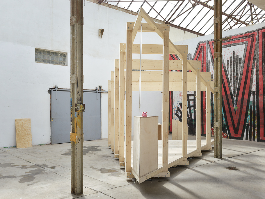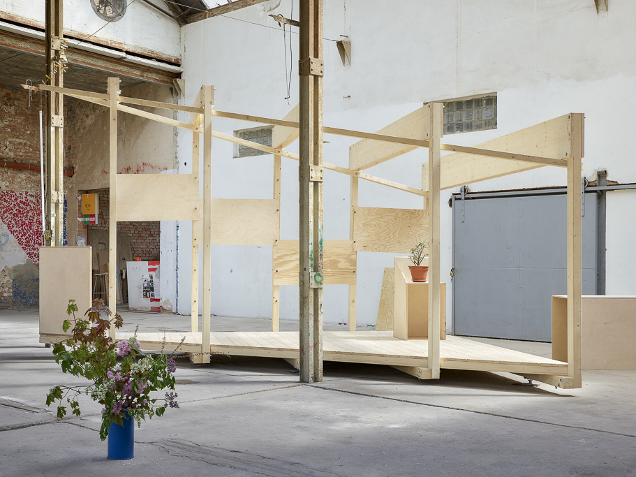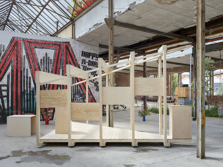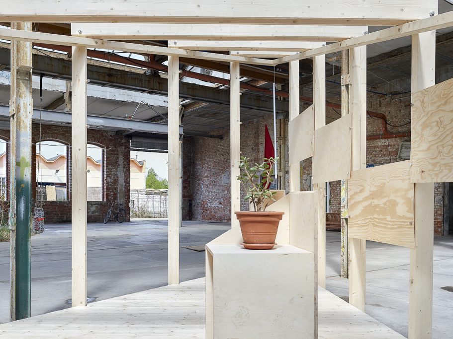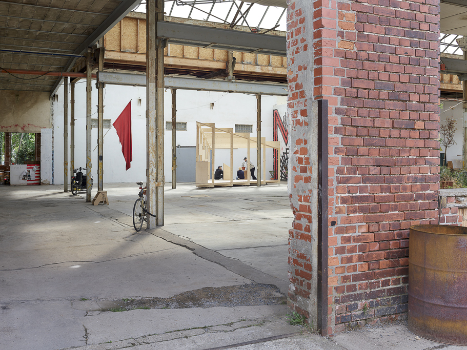 This ambiguous spirit is mirrored in the Glasfabrik itself, a former glass factory in Leipzig now repurposed as a space for cultural, urban, and creative production. The building’s one thousand square meter hall, covered by an industrial glass roof yet missing windows, offers an unstable atmosphere, at once inside and outside, private and public, raw and charged with latent potential. Over the years, this setting has been subtly claimed by architectural gestures such as an indoor landscape, a sauna, and informal furnishings that challenge what architecture can be within such a post industrial void.
